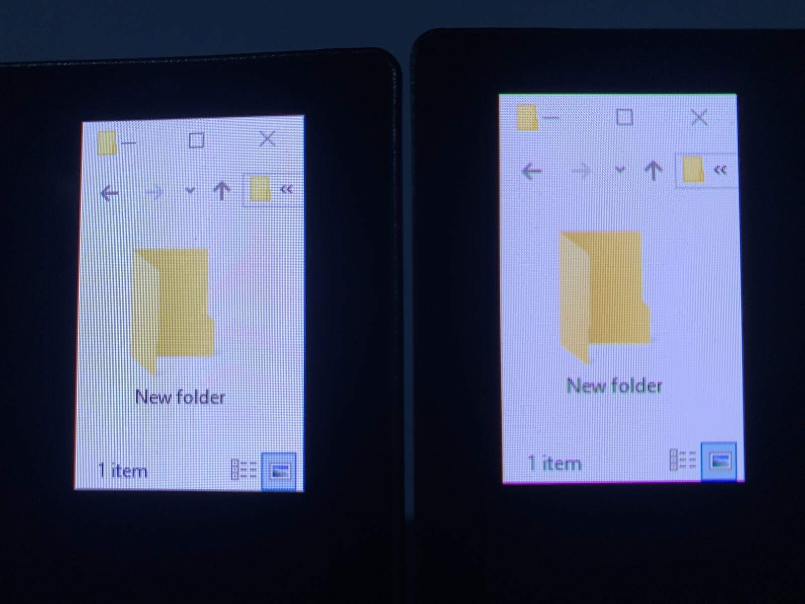 Notice the thin green line at the top of the window and the magenta line at the bottom on the MSI MPG 271QR X50 (right). There’s also some green and magenta fringing around the ‘New folder’ text.
