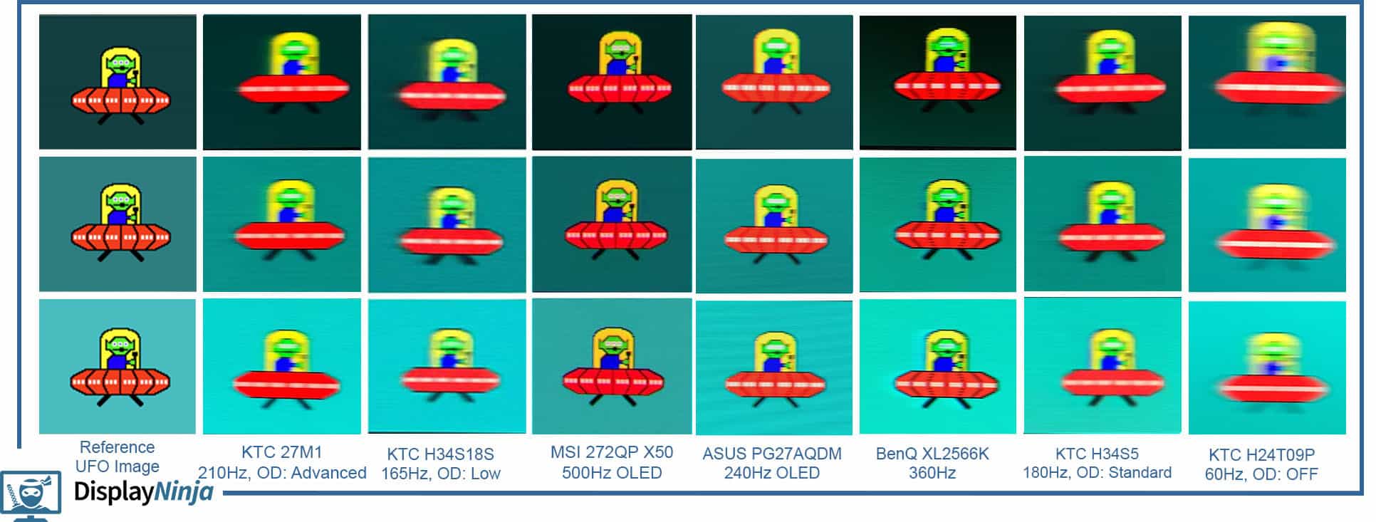 Here’s how these tests look in Blur Busters’ UFO ghosting test. We used 960 Pixels Per Sec, shutter speed set to 1/4 of the refresh rate with fixed focus, ISO and color temperature (6500K).